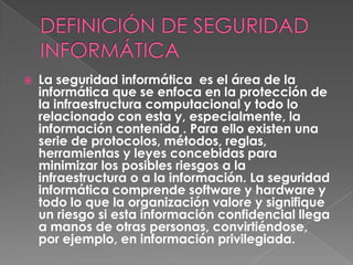 La seguridad informática se enfoca en proteger la infraestructura computacional y la información contenida de amenazas internas y externas mediante protocolos, métodos, herramientas y leyes. Las amenazas pueden provenir de usuarios, programas maliciosos, intrusos o desastres e incluyen virus, troyanos, ataques de denegación de servicio y robo de información confidencial. Para mitigar los riesgos crecientes, es necesario implementar medidas de seguridad como antivirus, cortafuegos y detección de intrusion