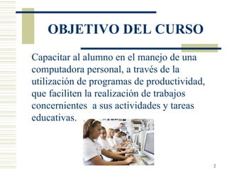 Este documento presenta una introducción básica a la informática. Explica que la informática es la ciencia del tratamiento de la información por medio de computadoras. Define las partes principales de una computadora, incluyendo el teclado, monitor, unidades de disco, impresora y la unidad central de procesamiento. También menciona algunos periféricos adicionales como mouse, scanner y modem. El objetivo del curso es capacitar a los estudiantes en el uso de programas de productividad para facilitar sus tareas educativas.