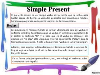 El documento proporciona información sobre los tiempos verbales simple presente, pasado y futuro en inglés. Explica las reglas y estructuras para formar oraciones afirmativas, negativas e interrogativas en cada tiempo, incluyendo ejemplos. También cubre los tiempos verbales presente continuo, pasado continuo y futuro continuo, detallando cómo se forman oraciones en estos tiempos.