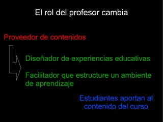 El rol del docente y del estudiante están cambiando en el mundo virtual. El rol del profesor pasa de proveer contenido a diseñar experiencias educativas y facilitar un ambiente de aprendizaje, mientras que los estudiantes aportan contenido y se les exige mayor independencia, colaboración y respeto cultural. Tanto profesores como estudiantes deben desarrollar habilidades tecnológicas y comunicativas para funcionar en este nuevo entorno educativo virtual.