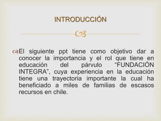  El siguiente ppttiene como objetivo dar a conocer la importancia y el rol que tiene en educación del párvulo “FUNDACIÓN INTEGRA”, cuya experiencia en la educación tiene una trayectoria importante la cual ha beneficiado a miles de familias de escasos recursos en chile. INTRODUCCIÓN