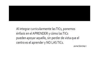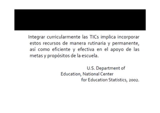 La integración curricular de TICs implica incorporar las tecnologías de la información y comunicación en el currículum escolar de manera planificada y significativa para apoyar el aprendizaje de los estudiantes. Esto requiere que los docentes utilicen las TICs a diferentes niveles, desde el uso básico de herramientas hasta la transformación de actividades, así como contar con el apoyo y los recursos necesarios para implementar esta integración de manera efectiva.