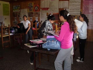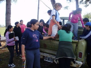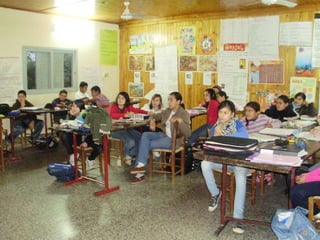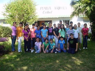 Este documento resume la información de la Escuela de la Familia Agrícola N° 8210 de Arroyo Ceibal. Enumera las localidades de donde provienen los 139 alumnos de los dos ciclos, incluyendo Tres Isletas, Campo Ubajó, Guadalupe Norte y Avellaneda. Luego brinda detalles sobre los 24 alumnos del 7° grado, especificando que hay 16 mujeres y 8 varones. Finalmente, menciona algunos de los momentos educativos y recreativos que comparten los estudiantes, como actividades de limp