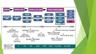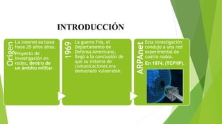 La Internet se originó en 1969 como un proyecto de investigación militar estadounidense llamado ARPANET para crear una red de comunicaciones descentralizada y resistente. En 1972 se introdujo el correo electrónico para facilitar la comunicación entre usuarios, y en 1974 se establecieron los protocolos TCP/IP que permitieron la interconexión de miles de equipos y el crecimiento de ARPANET a lo que hoy conocemos como Internet.