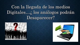 Este documento resume las características y funciones de los medios de comunicación análogos y digitales. Los medios análogos como la televisión, la radio y los periódicos tienen la función de informar al público a bajo costo, pero con una transmisión tardía, mientras que los medios digitales como internet y las redes sociales permiten obtener información de forma instantánea y realizar múltiples actividades, pero la información puede ser poco fiable. Ambos medios cumplen la función de mantener informada a la audiencia aunque de diferente