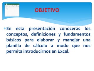 El documento proporciona una introducción a Microsoft Excel, incluyendo definiciones de hoja de cálculo, filas, columnas y celdas. Explica que Excel permite almacenar y analizar datos, y crear gráficos y fórmulas para resolver problemas. También describe las partes principales de la interfaz de Excel y algunos comandos básicos.