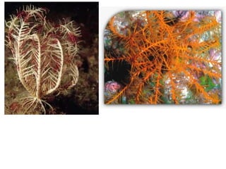 Este documento lista los principales grupos de animales, incluyendo esponjas, cnidarios, anélidos, moluscos, artrópodos y equinodermos. Proporciona una clasificación básica de los filos y clases dentro de cada uno de estos grupos principales del reino animal.