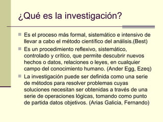 El documento describe los diferentes tipos de investigación, paradigmas y metodologías. Explica que la investigación es un proceso sistemático para resolver problemas mediante métodos lógicos y datos objetivos. Detalla los paradigmas positivista, interpretativo y crítico-dialéctico, así como los métodos cuantitativos y cualitativos utilizados en cada uno.