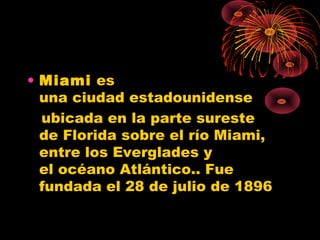 Miami es una ciudad estadounidense fundada en 1896 ubicada en el sureste de Florida, conocida por sus animadas playas con temperaturas cálidas durante todo el año, sus fiestas divertidas y entretenidas, y sus museos educativos como el Museo Miami Children’s y el Museo de Arte de Miami.
