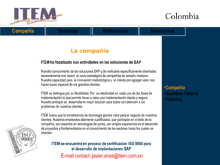 La compañía ITEM se especializa en soluciones SAP y ofrece servicios como implantaciones, soporte, capacitación y optimización de sistemas SAP. Sus valores incluyen la innovación, el trabajo en equipo, el enfoque en el cliente, y la motivación e iniciativa. ITEM ofrece soluciones como SAP R/3, MySAP All-in-One y SAP Netweaver para satisfacer las necesidades de sus clientes.