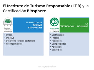 Este documento describe las actividades y objetivos del Instituto de Turismo Responsable (ITR). El ITR promueve el desarrollo sostenible en la industria turística siguiendo las recomendaciones de organizaciones internacionales. El ITR ha creado el Sistema de Turismo Responsable y la Certificación Biosphere para destinos, productos y empresas que demuestren una gestión sostenible en términos ambientales, sociales y culturales.