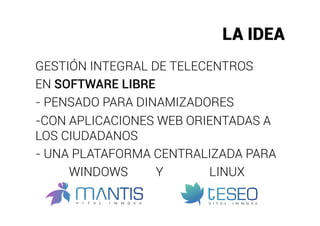Este documento presenta una plataforma de gestión de telecentros desarrollada por Vital Innova llamada Gestión de Telecentros. La plataforma ofrece aplicaciones integradas para la gestión de salas, equipos, usuarios, actividades, informes e indicadores para dinamizadores de telecentros con equipos Windows y Linux. El software es de código abierto y ha sido implantado con éxito en más de 200 telecentros. La empresa busca convertirse en el software de referencia para la gestión de telecentros en Europa y Latinoamérica.