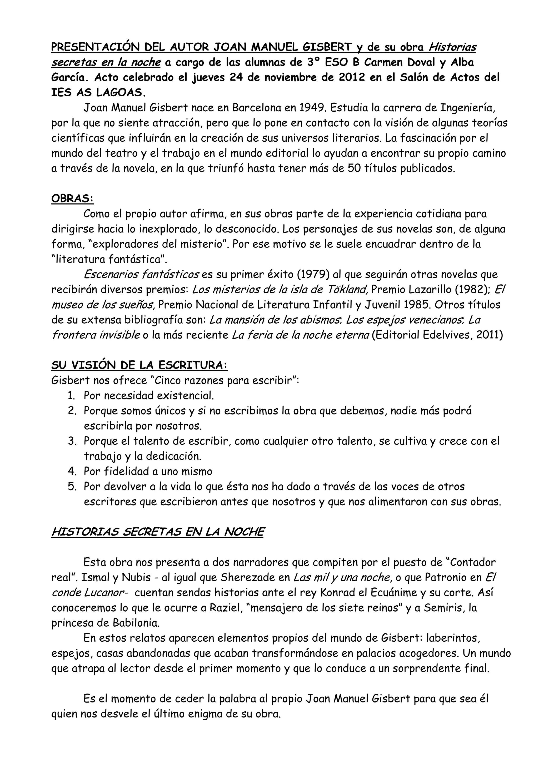 Este documento presenta al autor Joan Manuel Gisbert y su obra Historias secretas en la noche. Gisbert nació en 1949 en Barcelona y estudió ingeniería aunque se sintió más atraído por el teatro y la literatura. Ha publicado más de 50 títulos y sus obras suelen encuadrarse en la literatura fantástica. Historias secretas en la noche presenta dos narradores que compiten por el puesto de "Contador real" y cuentan historias ante el rey para entretenerlo, las cuales contienen elementos propios del mundo