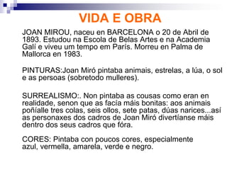 Joan Miró fue un pintor español nacido en Barcelona en 1893. Pintaba en un estilo surrealista, representando animales, estrellas, la luna y el sol de forma estilizada y no realista. Usaba pocos colores, principalmente azul, rojo, amarillo, verde y negro. Miró vivió parte de su vida en París y murió en 1983 en Mallorca, donde dejó una importante obra pictórica y escultórica en un estilo surrealista muy personal.