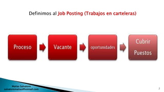 El documento describe los beneficios y desventajas de comunicar trabajos disponibles internamente a través de carteleras de empleos. Entre los beneficios se encuentran evitar la rotación laboral, generar motivación en los empleados al brindar oportunidades de crecimiento, y mejorar la comunicación entre departamentos. Algunas desventajas son que candidatos pueden no cumplir los requisitos del puesto, que el proceso se realice por compromiso sin convencimiento de su efectividad, y que genere frustración en candidatos que no son seleccion
