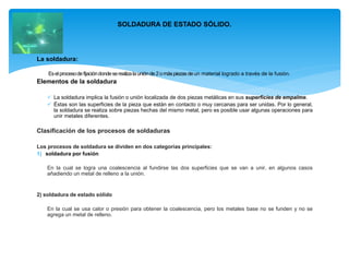 Este documento resume los diferentes tipos de soldadura de estado sólido como la soldadura por forjado, soldadura explosiva, soldadura ultrasónica, soldadura en frío, soldadura por fricción, soldadura por fricción-agitación, soldadura por inducción, soldadura de rodillo, soldadura por difusión, soldadura por presión caliente y soldadura por alta frecuencia. También describe brevemente las ventajas y desventajas de la soldadura.