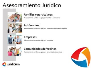 El documento detalla los servicios de asesoramiento jurídico ofrecidos por un equipo legal para familias, particulares, autónomos y empresas, que incluyen elaboración de documentos, reclamaciones, mediación en conflictos, y asistencia legal laboral. Además, se describe el proceso y precios relacionados con divorcios, desahucios y tramitación de herencias, asegurando atención personalizada y asesoría continua. El servicio se centra en lograr la mejor solución legal para cada situación, con un enfoque en negociaciones y resolución amistosa de conflictos.