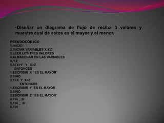 Este documento contiene tres ejercicios de diagramas de flujo propuestos a una estudiante. El primero recibe tres valores y determina el mayor y el menor. El segundo suma tres valores siempre que sean mayores a 10. El tercero suma dos valores en un ciclo de tres repeticiones y cuenta cuántas veces el resultado es positivo. Para cada ejercicio se proporciona el pseudocódigo correspondiente.