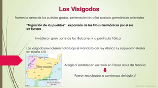 1) Los visigodos invadieron gran parte de Europa y establecieron reinos en España y el sur de Francia. 2) Los lombardos invadieron el norte de Italia y establecieron un reino que duró hasta el siglo VIII. 3) Los anglosajones invadieron el sur y este de Gran Bretaña desde el siglo V hasta la conquista normanda, estableciendo el periodo anglosajón de la historia inglesa.