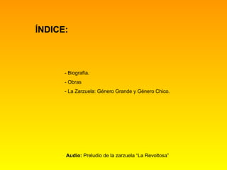 Ruperto Chapí fue un compositor español destacado en el género de la zarzuela, nacido el 27 de marzo de 1851 y fallecido el 25 de marzo de 1909. Fundó en 1893 la Sociedad General de Autores y Escritores para proteger los derechos de los compositores y tuvo éxito con obras tanto de género grande como chico. La zarzuela, un género lírico-dramático español, combina melodías cantadas, diálogos hablados y bailes, y Chapí contribuyó significativamente a su popularidad y evolución en el siglo XIX.