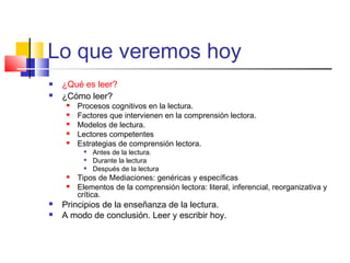 El documento describe los conceptos fundamentales relacionados con la lectura y la comprensión lectora. Explica que la lectura es un proceso de interacción entre el lector y el texto, donde el lector intenta satisfacer sus objetivos de lectura. También describe los procesos cognitivos implicados en la lectura, los factores que intervienen en la comprensión, los diferentes modelos de lectura, y las estrategias que se pueden usar antes, durante y después de la lectura para mejorar la comprensión. Finalmente, señala que la enseñanza de la lect
