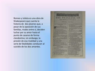 La obra de Shakespeare Romeo y Julieta narra la historia de amor entre dos jóvenes de familias rivales en Verona, los Montesco y los Capuleto, que deciden casarse a pesar de la oposición de sus familias. Sin embargo, una serie de malentendidos y fatalidades, incluyendo el destierro de Romeo y un plan fallido para evitar que Julieta se case con otro, conducen al suicidio de ambos amantes. Su muerte termina con la larga rivalidad entre sus familias.