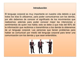 Este documento presenta una introducción al lenguaje corporal y su importancia en la comunicación. Explica que más del 60% de la información que compartimos con otros se transmite a través de señales no verbales. Luego describe diferentes tipos de lenguaje corporal como gestos, miradas, sonrisas y posturas, dando ejemplos de su significado. Concluye resaltando la relevancia de comprender el lenguaje corporal para mejorar la comunicación entre personas.