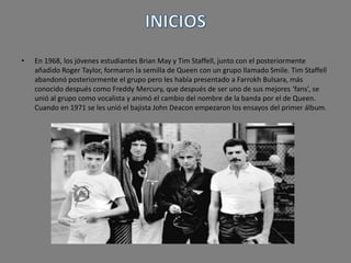 Queen se formó en 1968 y lanzó su álbum debut homónimo en 1973. En 1975, lanzaron A Night at the Opera, que incluyó la legendaria canción "Bohemian Rhapsody" y se convirtió en uno de los álbumes más caros producidos. A lo largo de la década de 1970, Queen experimentó con diferentes estilos musicales y lanzó varios éxitos mundiales. En 1991, el vocalista Freddie Mercury murió de bronconeumonia relacionada con el SIDA, pero la banda dejó un legado duradero.