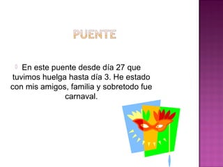 El documento describe cómo el autor pasó su puente escolar con su familia y amigos, celebrando el Día de las Islas Baleares y el carnaval. Participó en actividades como un partido de fútbol, pasar tiempo con su abuela, y salir con amigos a ver las celebraciones de carnaval, aunque en última instancia no se disfrazaron.
