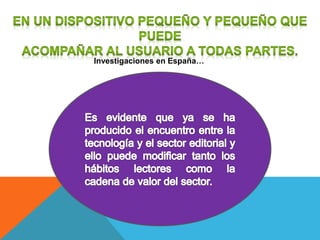 El documento habla sobre los libros electrónicos (eReaders). Explica que los eReaders permiten funciones como pasar páginas hacia adelante y hacia atrás, hacer zoom y marcar páginas, aunque la tecnología continúa avanzando. También discute los efectos de los eReaders en la industria del libro, incluidos los desafíos de los piratas informáticos y la necesidad de que los eBooks sean más baratos que sus contrapartes impresas. Finalmente, clasifica a los lectores en cuatro grupos seg
