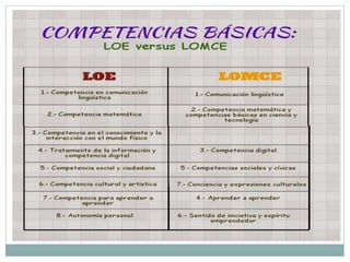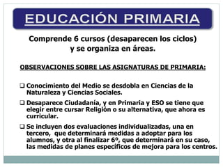 El documento resume los principales cambios introducidos por la LOMCE en Educación Primaria en España. Se establecen 6 cursos en lugar de ciclos, y las asignaturas de Conocimiento del Medio se dividen en Ciencias de la Naturaleza y Ciencias Sociales. Se incluyen dos evaluaciones individualizadas, una en tercero y otra al final de sexto curso. La evaluación en Primaria será continua y global, y tendrá en cuenta el progreso del conjunto de áreas.