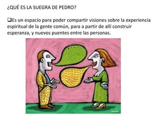 El documento describe la Suegra de Pedro como un espacio para compartir experiencias espirituales comunes y construir esperanza. Busca inspiración en el testimonio de la suegra de Pedro para servir al Evangelio a través de la vida cotidiana. Tiene como objetivo hablar de Dios a través de lo más común de la vida y mostrar que lo cotidiano es el escenario verdadero de la vida.
