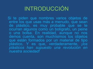 Los plásticos son sustancias orgánicas derivadas del petróleo que se obtienen mediante un proceso de polimerización. Los primeros plásticos se desarrollaron en 1860 para sustituir al marfil en la fabricación de bolas de billar. Existen plásticos naturales, semisintéticos y sintéticos. Los plásticos tienen propiedades como ser aislantes eléctricos y térmicos, ligeros pero resistentes, rígidos o flexibles, duros o blandos, adherentes o antiadher
