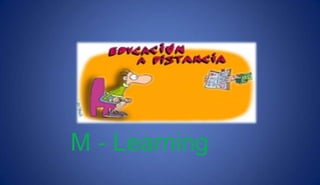 El documento describe el concepto de m-learning o aprendizaje móvil, el cual se basa en el uso de tecnologías móviles como teléfonos, tabletas y otros dispositivos para fines educativos. El m-learning evolucionó del e-learning y la educación a distancia. Ofrece características como aprendizaje informal, ubicuidad y personalización. Varios proyectos y universidades han adoptado el m-learning, aunque aún enfrenta desafíos como la resistencia al cambio y los altos costos de los dispositivos.