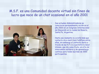 Maestros Sin Fronteras es una comunidad docente virtual sin fines de lucro que promueve el intercambio educativo entre más de 1000 participantes desde 2001, utilizando tecnologías de la información y la comunicación. A través de diversos proyectos, como 'Cuentamail' y 'Leemail', se fomenta la escritura y la lectura en cadena entre instituciones educativas en diferentes países de habla hispana. La organización ha sido reconocida por su labor, recibiendo premios y distinciones por su contribución a la educación en línea.