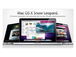 El sistema operativo Macintosh fue creado por Apple para sus computadoras Macintosh. Fue el primer sistema operativo dirigido al público en general en contar con una interfaz gráfica de usuario basada en ventanas, iconos y menús. Mac OS X Snow Leopard se enfocó en mejoras internas como el rendimiento, la eficiencia y la estabilidad. Algunas mejoras notables fueron una instalación más ligera, mayor velocidad en Time Machine y Safari, y soporte para 64 bits.