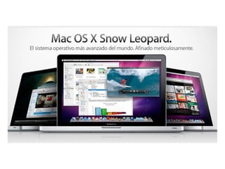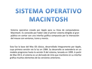 Mac OS es el sistema operativo creado por Apple para sus computadoras Macintosh. Fue el primero en contar con una interfaz gráfica basada en ventanas, iconos y menús. Se desarrolló en versiones progresivas hasta Mac OS 9 en 1999, luego evolucionó a Mac OS X, un sistema derivado de Unix que mantiene elementos gráficos de versiones anteriores.