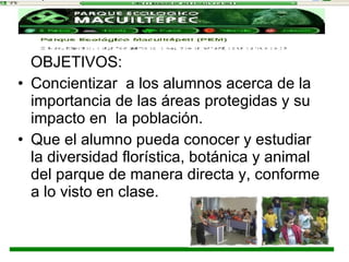 El documento describe un viaje de estudios al Parque Ecológico Macuiltépec en Xalapa, Veracruz. Los objetivos son concientizar a los estudiantes sobre la importancia de las áreas protegidas y permitirles estudiar la diversidad florística y animal directamente. El parque de 30 hectáreas es un antiguo cono volcánico que provee servicios ambientales como captura de carbono y agua para la ciudad. El parque ofrece educación ambiental a través de su museo con exhibiciones sobre fauna, aves, anfib