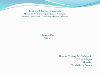 La percepción visual es la capacidad de interpretar lo que se ve a través del sentido de la vista. Involucra los ojos, el cerebro y la luz. Los elementos que intervienen son la retina, el nervio óptico y el cerebro, que procesa la información visual. Las leyes de la Gestalt, como la figura-fondo y la proximidad, influyen en cómo se perciben los elementos arquitectónicos y urbanos. Existen diferentes tipos de espacio visual como el liso, ambiguo y conflictivo. La radiación se refiere a la estructura