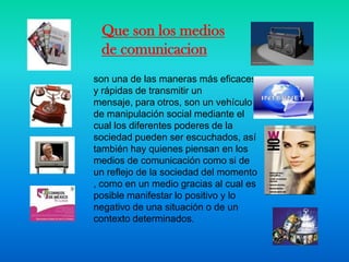 Los medios de comunicación son diferentes maneras de transmitir mensajes a otros de forma rápida y eficaz, pero también pueden ser usados para manipulación social o como reflejo de la sociedad en un momento dado, tanto de manera positiva como negativa. El documento luego define varios medios de comunicación como periódicos, teléfonos, televisión, correo, radio, internet y revistas.