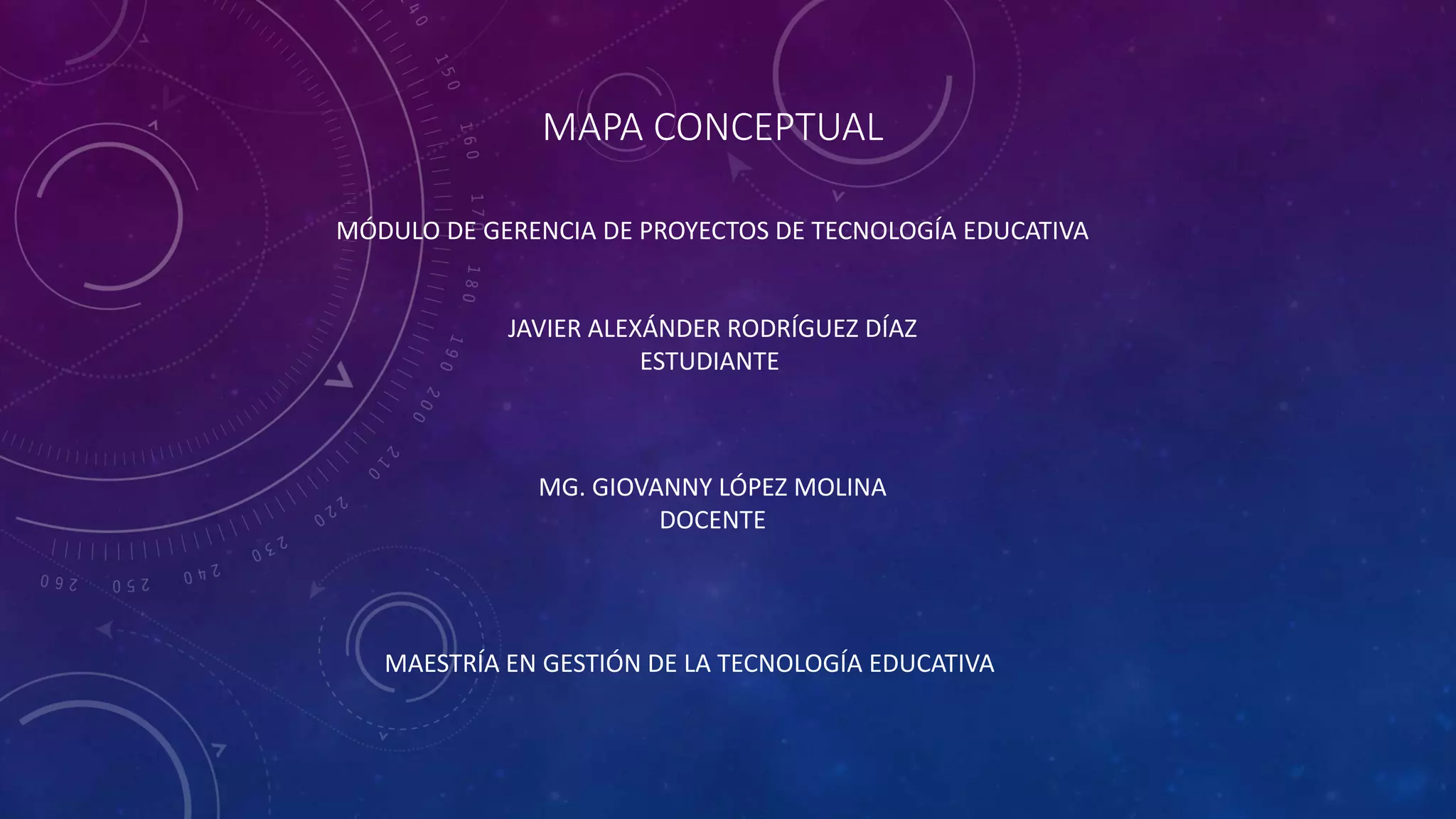 Este documento presenta un mapa conceptual del módulo de gerencia de proyectos de tecnología educativa realizado por Javier Alexánder Rodríguez Díaz como estudiante de la maestría en gestión de la tecnología educativa bajo la supervisión del docente Mg. Giovanny López Molina.