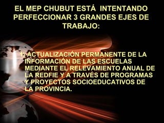 El MEPC Chubut está realizando esfuerzos en tres áreas clave: actualización de la información escolar, uso del mapa educativo como herramienta gráfica, y migración a software libre para la gestión de información geográfica. Se están llevando a cabo capacitaciones y se han creado mapas temáticos para facilitar la enseñanza. Además, se han implementado metodologías de formación tanto virtual como presencial para el personal educativo.