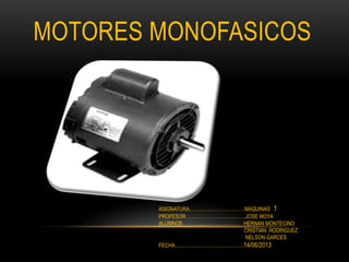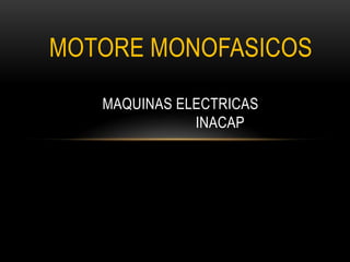 Este documento describe los motores monofásicos, incluyendo que tienen una sola fase de alimentación y necesitan dispositivos extras como bobinados auxiliares para iniciar el movimiento. Explica que los bobinados auxiliares crean una fase ficticia que permite un campo giratorio para dar par y movimiento al motor. También resume los diferentes tipos de motores monofásicos como los de fase partida, con condensador de arranque y con condensador permanente.