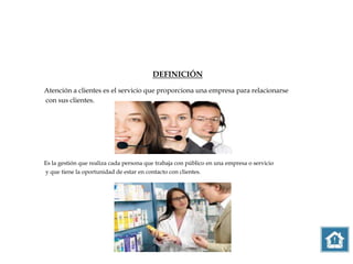 Este documento define la atención al cliente y su importancia para las empresas. Explica que la atención al cliente implica escuchar y comprender a los clientes de manera empática. También identifica diferentes tipos de clientes y técnicas como la comunicación verbal y no verbal. Finalmente, destaca que una buena atención al cliente genera mayor rentabilidad para las empresas a través de la retención de clientes satisfechos y la captación de nuevos clientes.