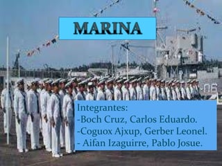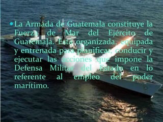 La Armada de Guatemala es la fuerza naval del ejército, encargada de la defensa del estado en aguas territoriales y fronteras marítimas. Está compuesta por dos comandos navales y dos bases, y su misión principal es garantizar la soberanía nacional en diversas zonas acuáticas. Además, se invita a los interesados a unirse a esta fuerza a través de la Escuela Politécnica, cumpliendo con ciertos requisitos.
