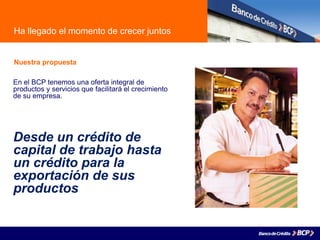 El Banco de Crédito BCP ofrece una variedad de productos y servicios de financiamiento para pequeñas empresas, incluyendo créditos para capital de trabajo como tarjetas de crédito y líneas de crédito, créditos para la compra de activos fijos y proyectos especiales, y beneficios adicionales como capacitación y eventos empresariales. El documento proporciona detalles sobre cada uno de estos productos y servicios de financiamiento, así como los requisitos y beneficios de trabajar con el BCP.