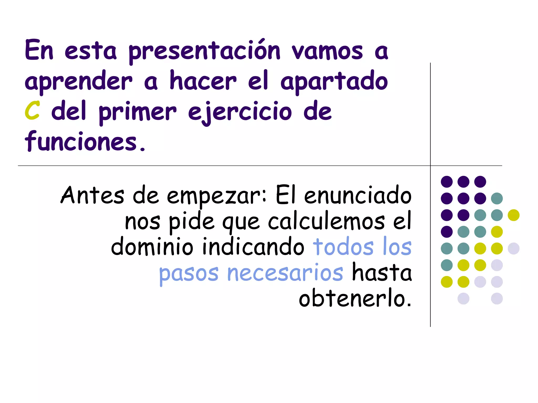 El documento resume los pasos para calcular el dominio de una función racional. Explica que el dominio incluye todos los números reales excepto aquellos que hacen que el denominador sea cero. Para la función f(x)=3x-5/x-2, se determina que el denominador es cero cuando x=2, por lo que el dominio es R-{2}.