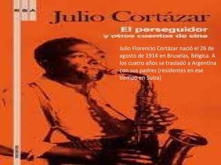 Julio Cortázar nació en Bruselas en 1914 y se mudó a Argentina de niño. Se graduó como maestro y trabajó como docente y traductor en Argentina y Francia. En 1951 se mudó definitivamente a París donde trabajó como traductor para la UNESCO y desarrolló una prolífica carrera literaria hasta su muerte en 1984.