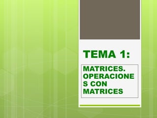 Este documento trata sobre matrices. Define una matriz, sus elementos, dimensión y orden. Explica los diferentes tipos de matrices como cuadradas, rectangulares, nulas, etc. Describe operaciones con matrices como suma, producto por escalar y producto entre matrices. También cubre cálculo de matriz inversa mediante el método de Gauss y el concepto de rango de una matriz.