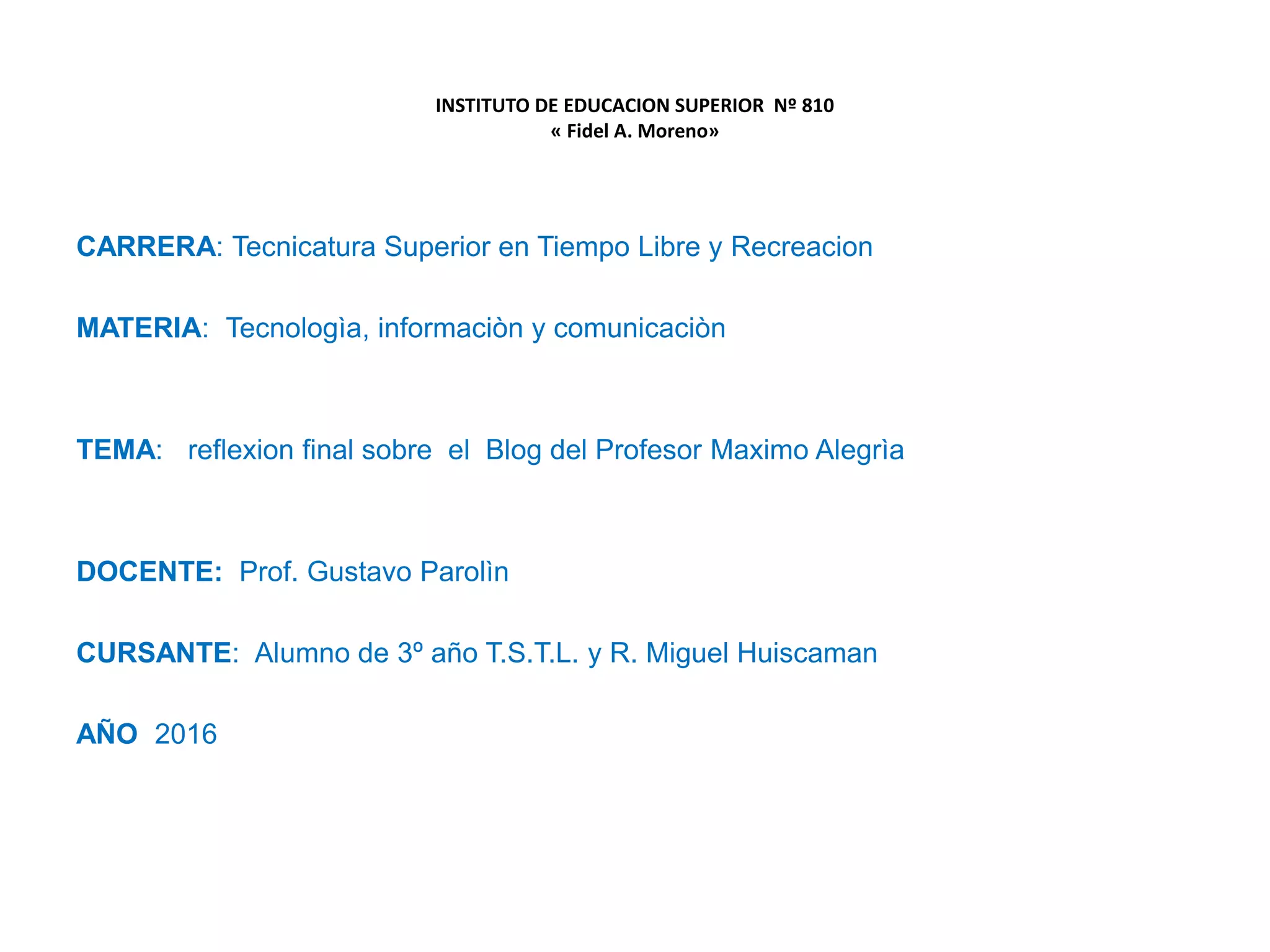 Este documento resume la reflexión de un alumno sobre el blog de su profesor Maximo Alegría. El alumno identifica las fortalezas del blog como la dedicación, claridad y comprensión del profesor. Las debilidades incluyen que había mucho contenido en poco tiempo y poco repaso de nuevas herramientas. El alumno sugiere empezar a enseñar TIC desde el primer año de la carrera para tres años.